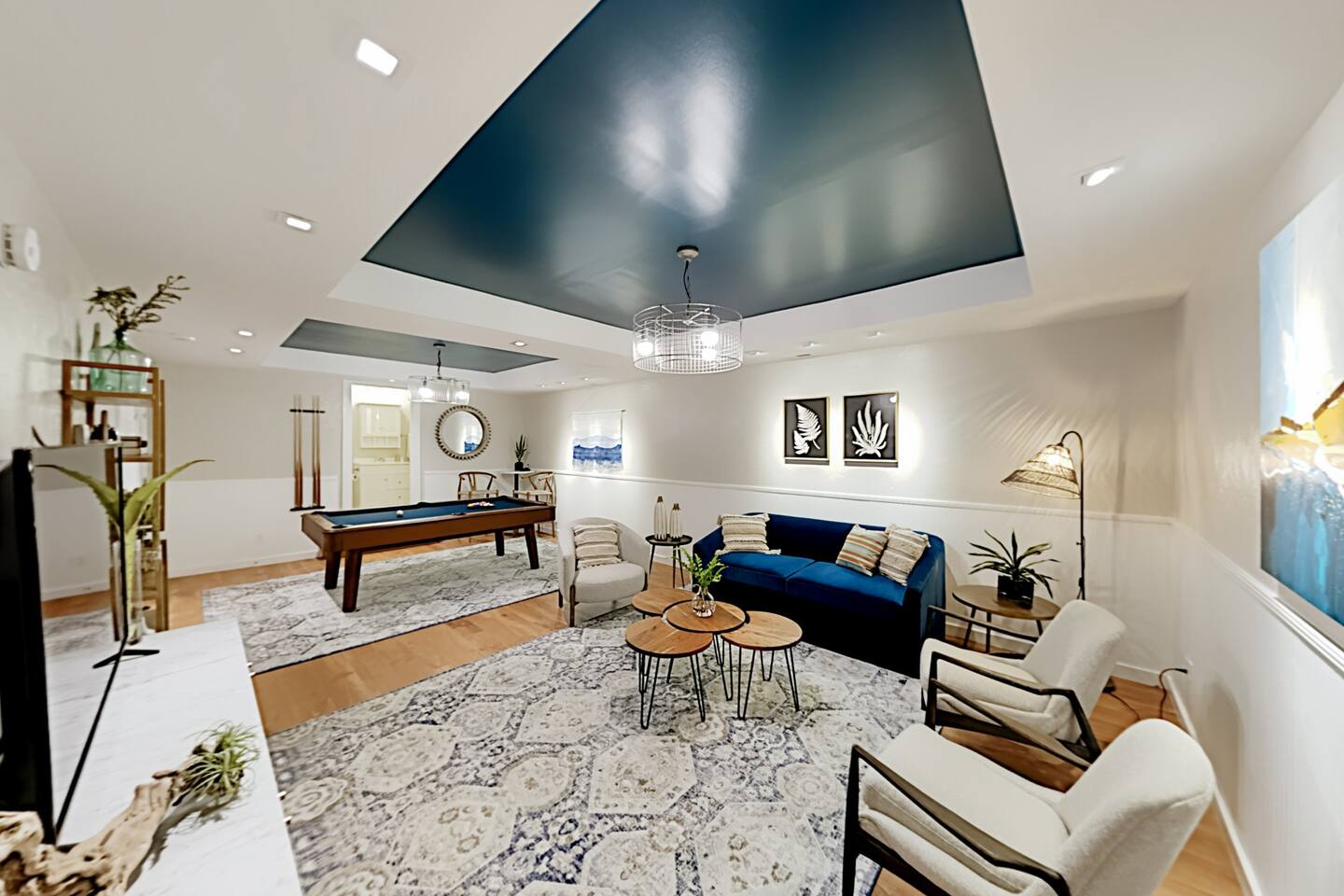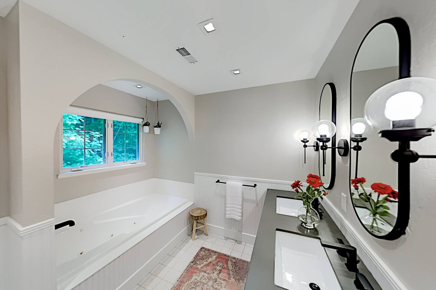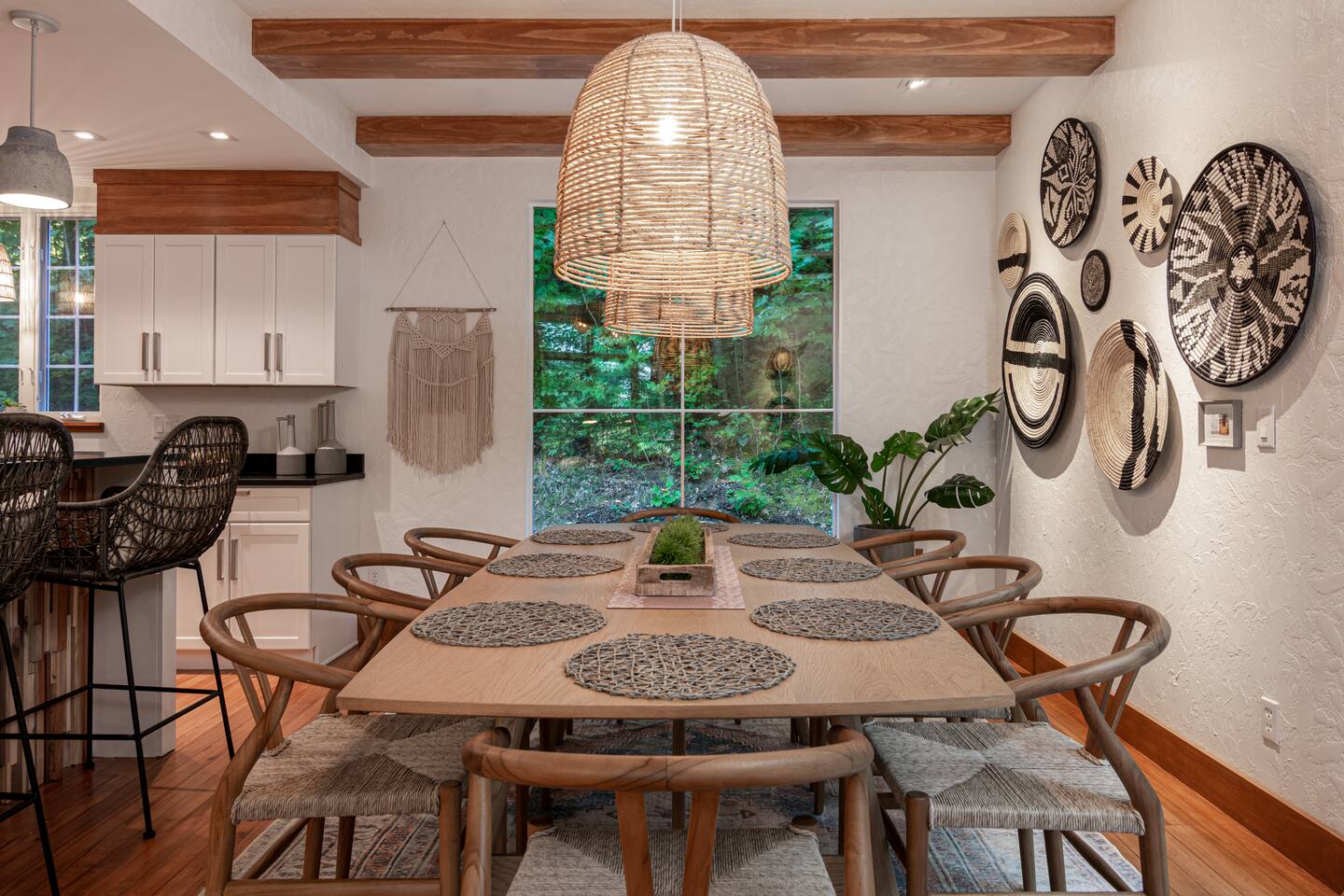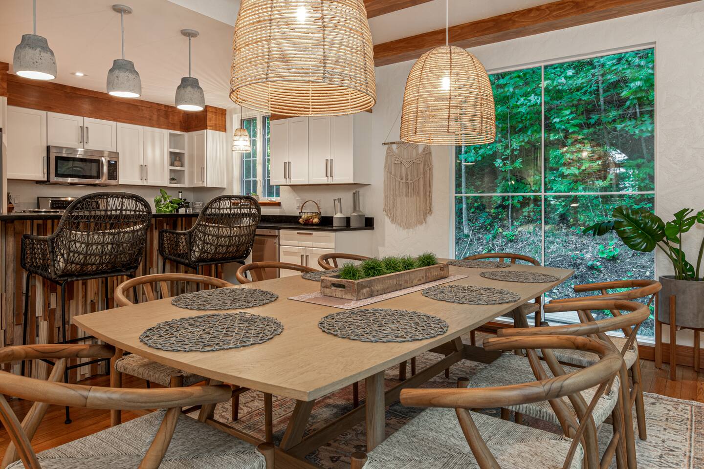 Inside, cathedral ceilings and antique heart pine floors create a warm, inviting atmosphere. Unwind in the stylish living area with a smart TV, challenge your group to a game of billiards, or plan your adventures from the dedicated home office. Step outside to soak in the private hot tub, gather around the fire pit, or relax to the soothing sounds of the serene waterfall on the deck. ★☆ NEARBY ATTRACTIONS & LANDMARK ☆★ .☛ 5.8 mi – Downtown Asheville .☛ 6.0 mi – Biltmore Estate .☛ 6.2 mi – River Arts District .☛ 6.5 mi – Asheville Art Museum .☛ 7.0 mi – Blue Ridge Parkway .☛ 7.4 mi – Pack Square Park .☛ 8.0 mi – French Broad River .☛ 9.5 mi – Asheville Botanical Garden .☛ 10 mi – Pisgah National Forest .☛ 10 mi – North Carolina Arboretum .☛ 12 mi – Craggy Gardens .☛ 15 mi – Mount Mitchell State Park ★☆ BEDROOM & BATHROOM ARRANGEMENT ☆★ 🛏️ BR1: King Bed 🛏️ BR2: King Bed 🛏️ BR3: King Bed 🛏️ BR4: Twin Bed (2) 🛏️ BR5: Queen Pull-Out Sofa 🛁 Bathrooms: 2 Full Bathrooms ★☆ LIVING ROOM ☆★ You’ll love the open-concept living space with soaring cathedral ceilings, artistic décor, and plenty of natural light. Stream your favorite shows on the smart TV or relax after a day of exploring Asheville. ★☆ KITCHEN & DINING ☆★ Cook with ease in the fully equipped modern kitchen featuring stainless steel appliances, ample counter space, and everything you need to prepare meals. Enjoy your morning coffee at the breakfast bar or gather everyone around the dining table for a shared meal. ★☆ OUTDOOR SPACE ☆★ Step onto the deck and immerse yourself in nature. Soak in the private hot tub, enjoy evenings by the fire pit, and take in tranquil forest views enhanced by a peaceful waterfall—your own secluded outdoor oasis.